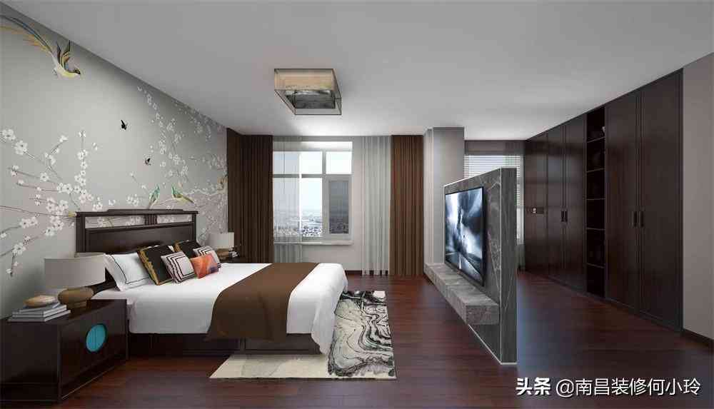 相对宽裕的户型面积,居住人口不多,四房改三房,主卧不仅有独立的卫浴间,还拥有一个衣帽间梳妆台和独立的书房,整体配色上以灰色和木色为主,床头一幅喜鹊报春背景和一张中式古典家具,层次对比突出,保持明朗的状态,沉稳儒雅。