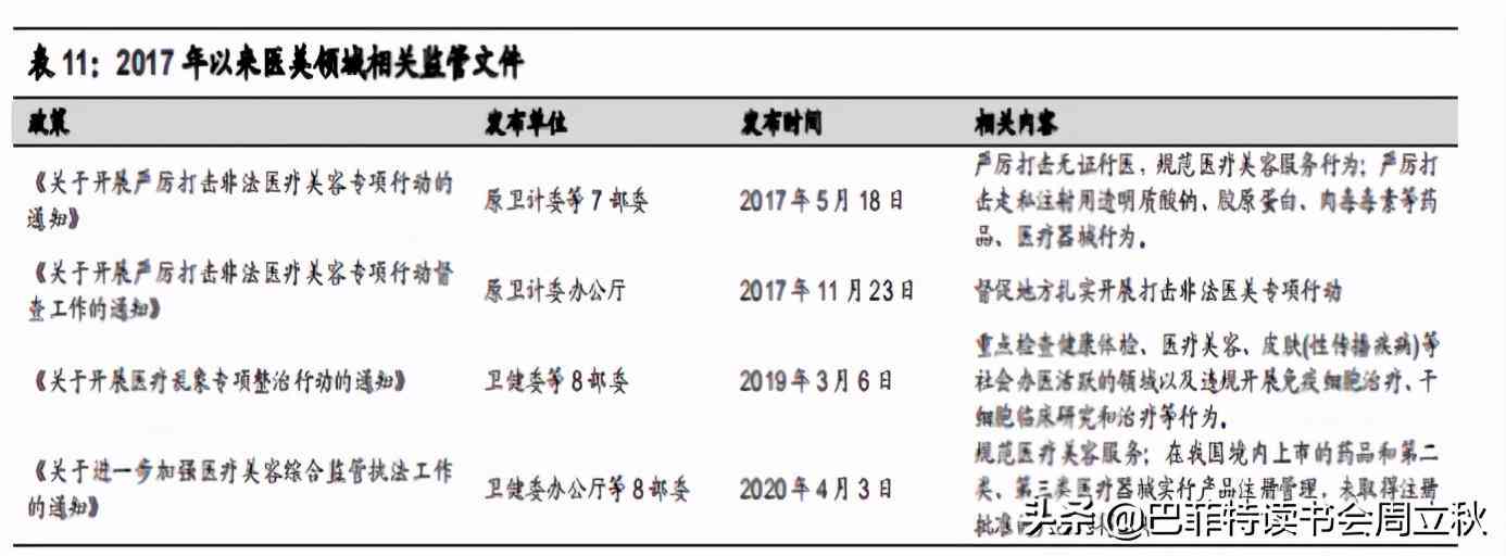 5、监管趋严推动供给端规范化发展。目前市场存在大量的非法医美机构、医美产品以及相关涉嫌虚假宣传的广告。据艾瑞咨询数据显示,2019年中国具备医疗美容资质的机构约13000家,合法医美机构仅占行业14%,合法合规医美机构仅占行业12%,合法医师仅占行业28%。鱼龙混杂的市场格局,也给消费者对医美行业带来了不好的印象,某种程度上会抑制部分消费需求,导致行业增速放缓,包括潜在消费者对事故频发的医美持观望状态和合规的医院和人才缺失,带来供给不足两方面。不过近年来医美行业监管正在逐步加强,下游医美机构的经营更加规范化,有利于增强消费者信任感。