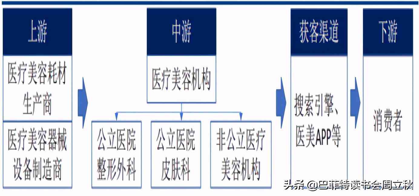 6、中游服务整体利润空间高,上游制造单体利润空间大。医疗美容行业的产业链主要包括三个核心环节:1)上游原料及药械供应商;2)中游服务机构;3)下游获客平台/渠道。