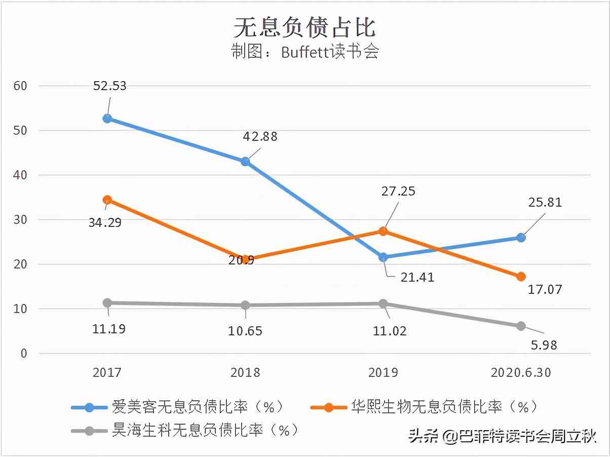 在资产负债率这个指标上我们已经发现三家公司的负债都不高,再细看的话,其中爱美客的无息负债占比在2020年中报时是最好的,昊海生科近几年都维持在10%左右,比较平稳。