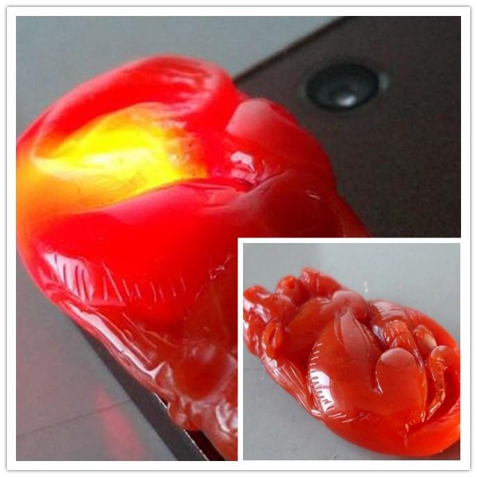 蒙料的质地差,石性较强(相互碰撞能感觉到脆性),鉴别特征是内部绺裂明显比缠丝多,红色的地方没有南红那么润,相对色暗,有时伴有草绿色的玛瑙以及水晶等杂质,透明的地方不够纯净,大多蒙料也是需要注胶处理的。