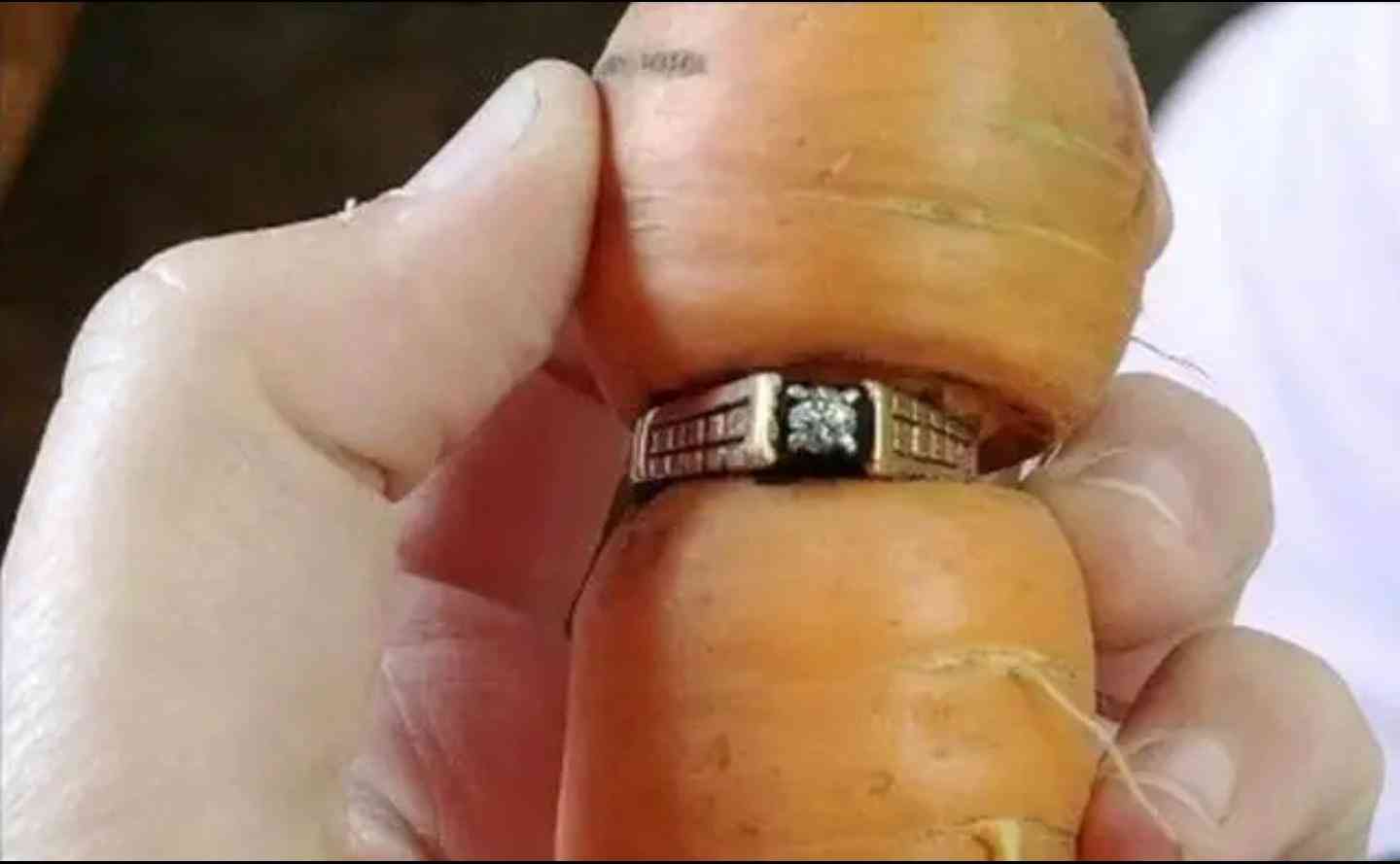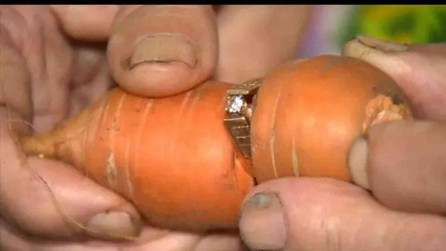 一枚钻石戒指已经深深陷入胡萝卜的腰间(图片来自头条原创者文章摘图)