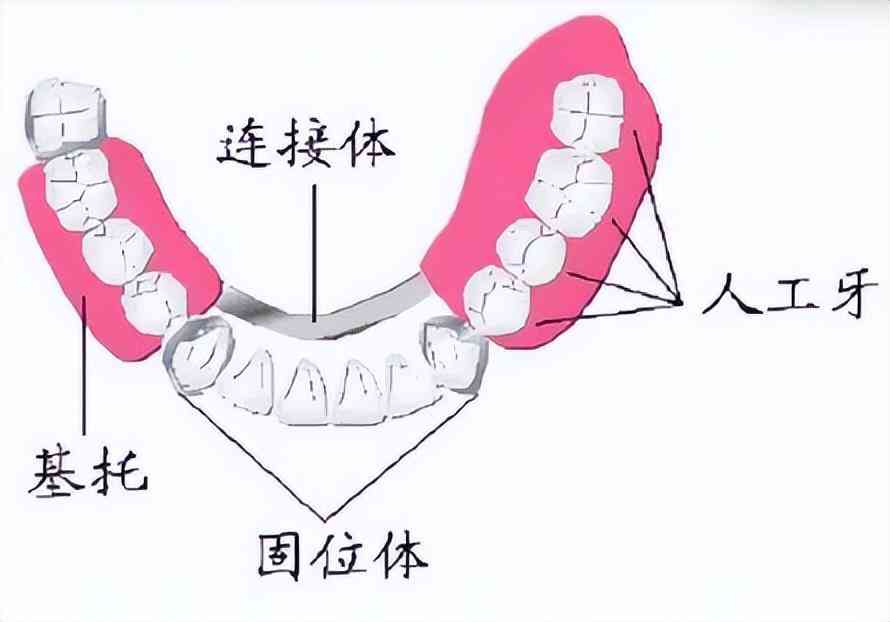 人工牙就是假牙,连接在基托上修补牙齿缺失的部分,而基托主要起到排列人工牙,连接固定装置的作用,固定体则和连接体一起安放在好牙上,固位后嚼东西时借好牙的力就能使用了。