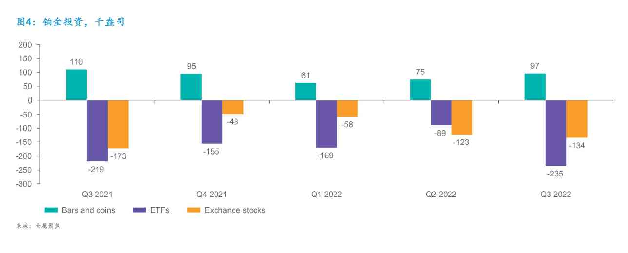上述WPIC报告统计显示,2022年第三季度铂金投资领域的净抛售额为27.2万盎司。其中铂金ETF抛售23.5万盎司;交易所铂金交割库存减少13.4万盎司;唯有铂金条币投资需求录得增长,为9.7万盎司,较第二季度环比增长29%,但同比下降了12%。由此预计2022全年铂金投资市场的净抛售额为52.5吨。