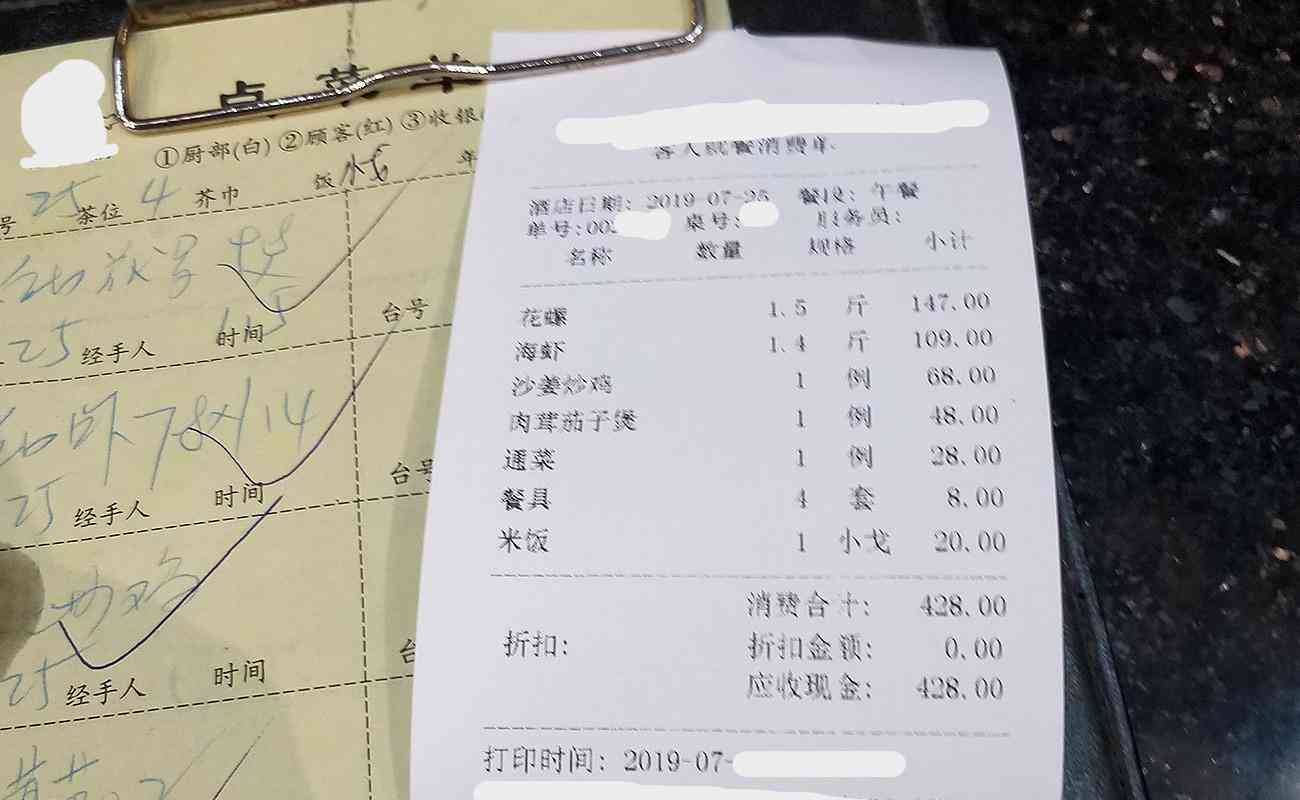 处泳池正下方有一间老贵的店,90+元一斤小虾、80+元一斤白贝等,四个人点了5个菜428元,还没吃饱。