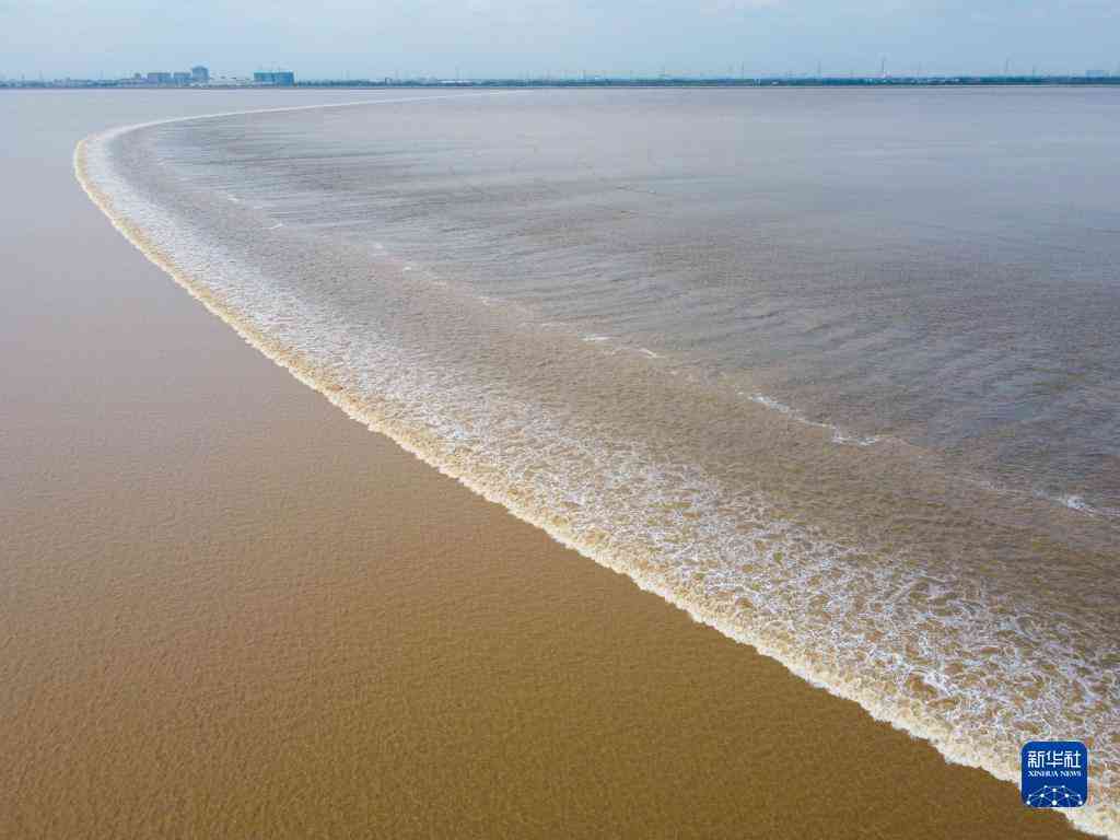 这是在杭州市钱塘新区拍摄的钱塘江一线潮奇观(2020年10月5日摄,无人机照片)。新华社记者 江汉 摄