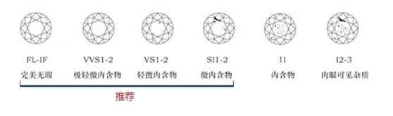 净度级别由高到低详细可分为FL,IF,VVS1,VVS2,VS1,VS2,SI1,SI2,SI3,I1,I2,I3。在十倍显微镜下仔细观察钻石洁净程度,瑕疵越少,则质量越好,愈有利于折射光芒,价格也相应地要高。一般来说VS级以上就很棒了,如果有预算限制,那么可以在这个C上宽容点,不然的话就要准备付出高昂的代价了。