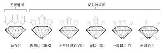 钻石的切工是指它的切磨比率的精确性和修饰完工后的完美性。切工决定了钻石的明亮度、火彩、闪光三大方面,好的切工让钻石的光彩发挥到最大,并且尽量保持原石重量。一般包括切磨比例Cut、抛光度Polish和对称修饰度Symmetry(即对称性)。