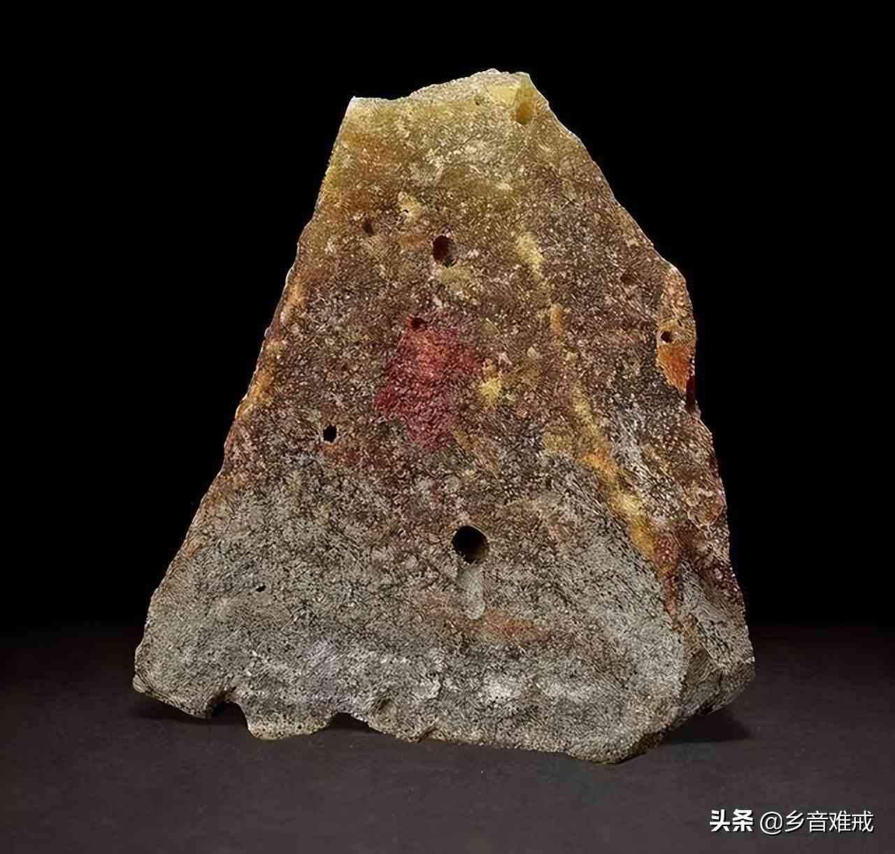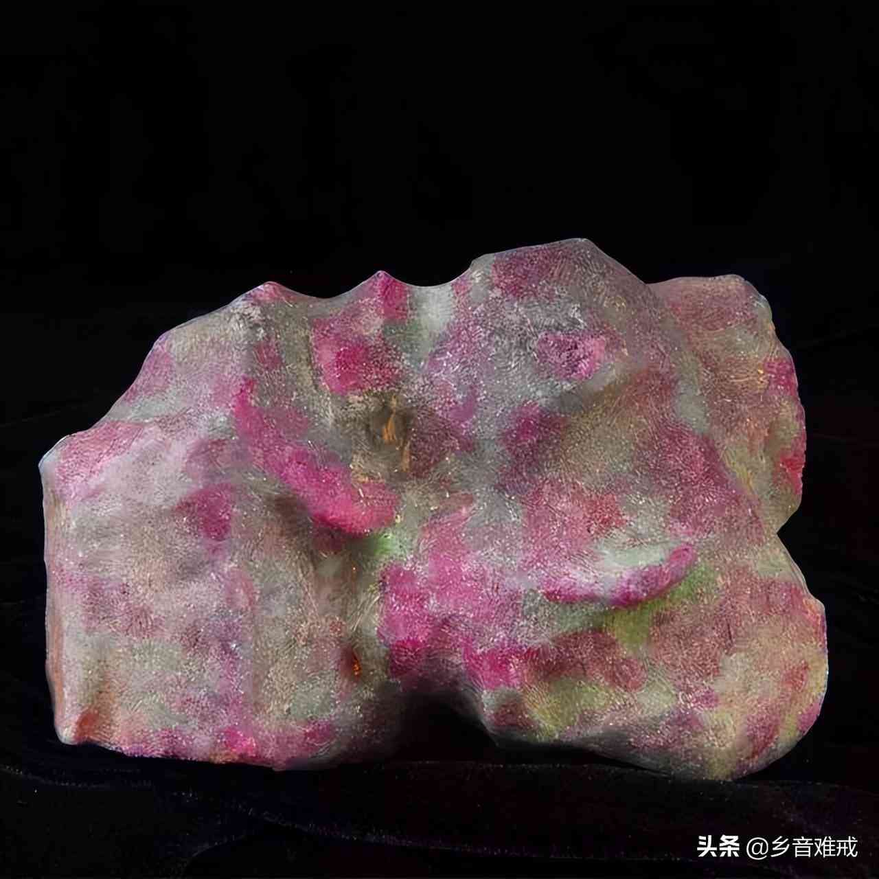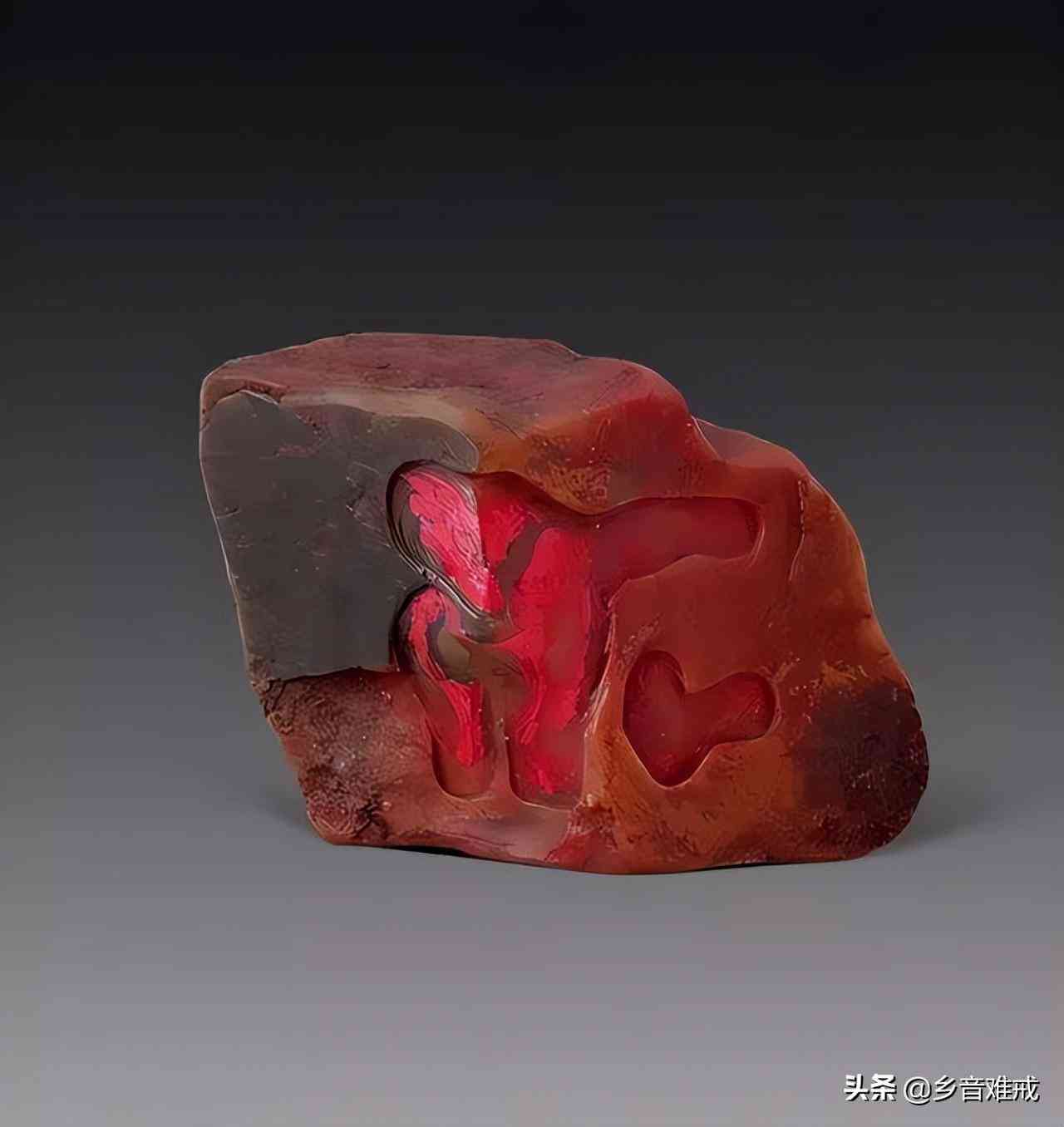 极品荔枝冻石,石性凝结,透明度强,晶莹透澈,红、黄、白、黑各色俱有,艳丽无比,肌里有粗萝卜丝纹,有些原石还有黄色皮。以色泽论,荔枝洞石无疑艳压群石,堪称。