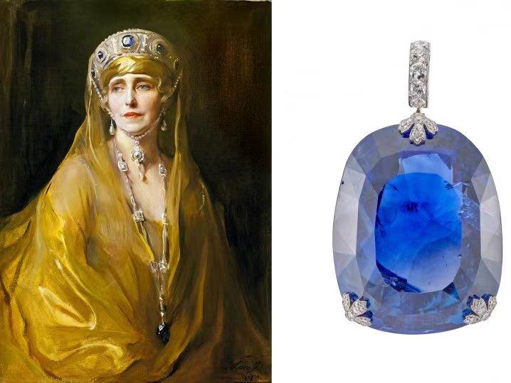 著名的玛丽王后是英国维多利亚女王和俄罗斯沙皇亚历山大二世的孙女,在 1922 年罗马尼亚国王斐迪南的加冕典礼上,她为她的丈夫费迪南德国王佩戴了这条历史悠久的蓝宝石吊坠项链。