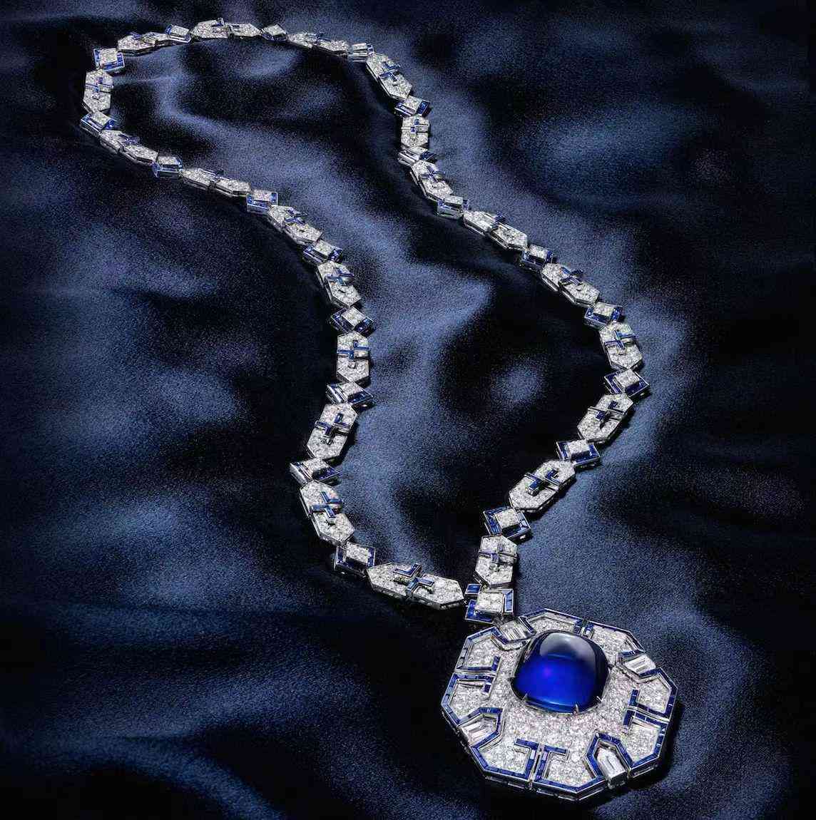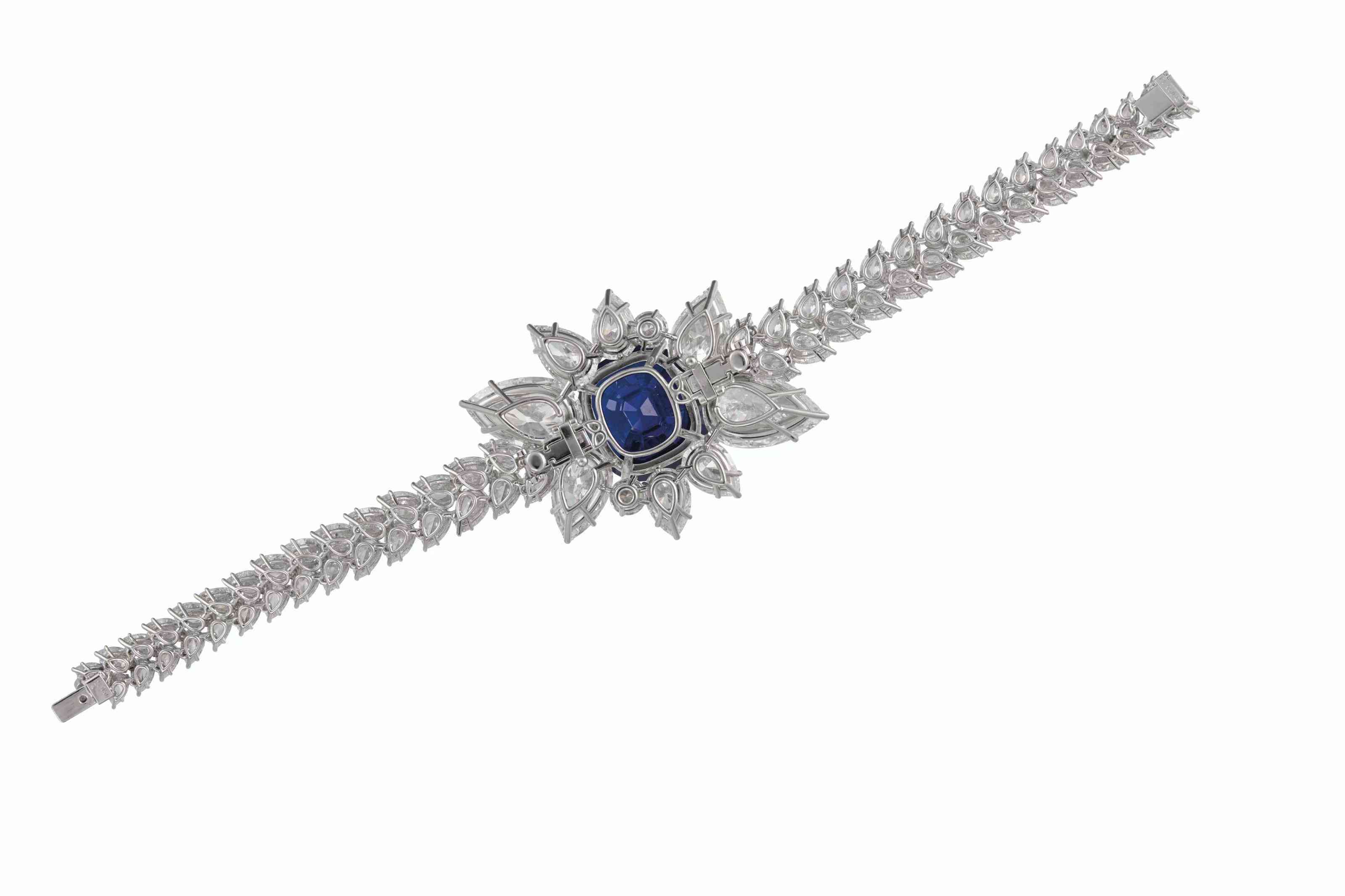 这颗枕形蓝宝石重 30.23 克拉,镶嵌总重约 42.35 克拉的榄尖形和水滴形钻石,由卡地亚签名、编号和印有卡地亚表壳编号,此外还有法国化验和印度的部分制造商标记。这颗蓝宝石天鹅绒般浓郁的蓝色色调是令人难以置信的微小、无法检测的内含物和均衡的微量元素混合的结果,这些元素是最好的克什米尔蓝宝石所特有的。