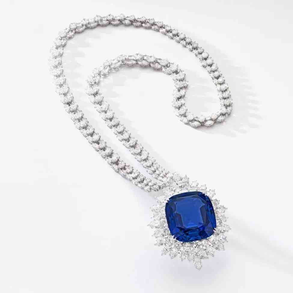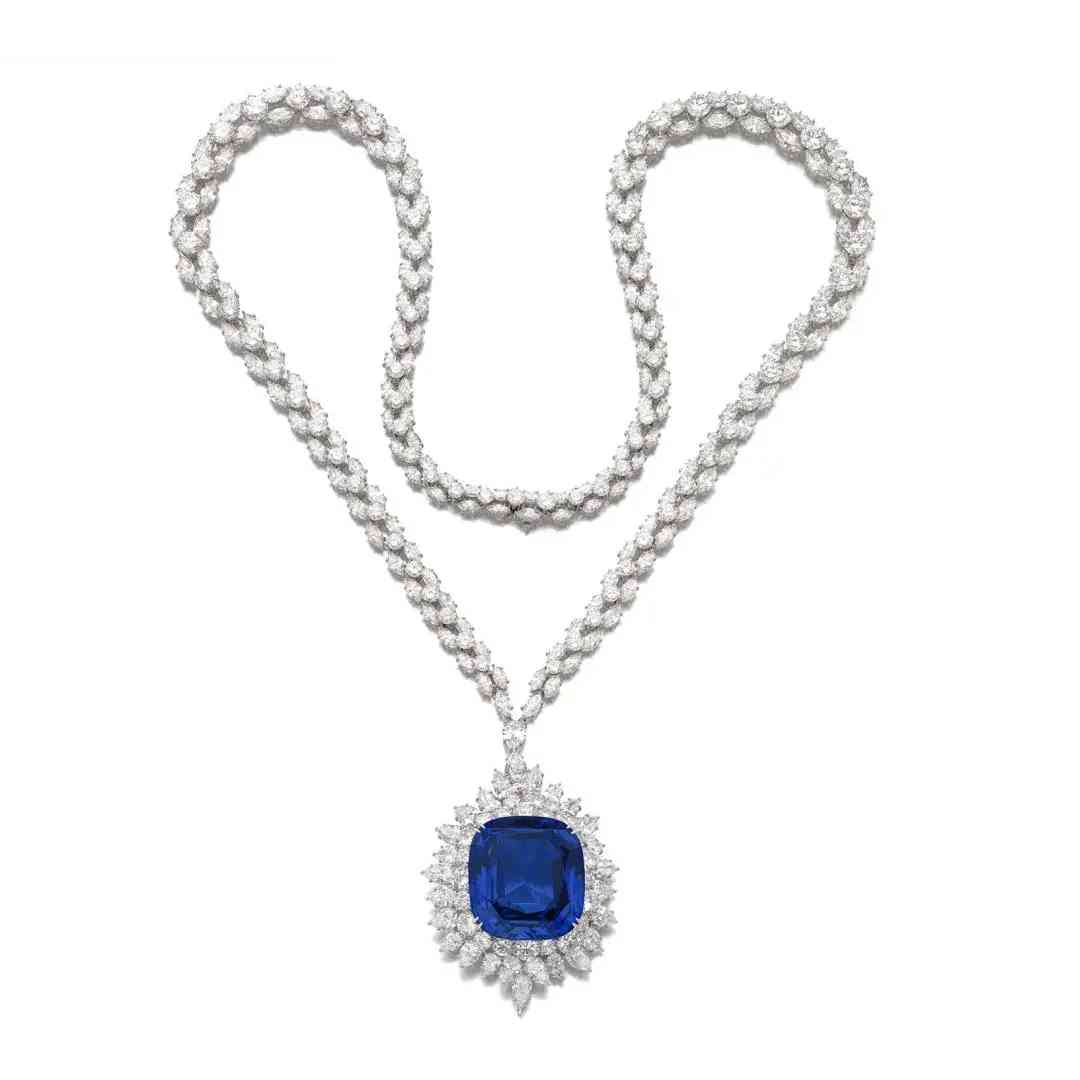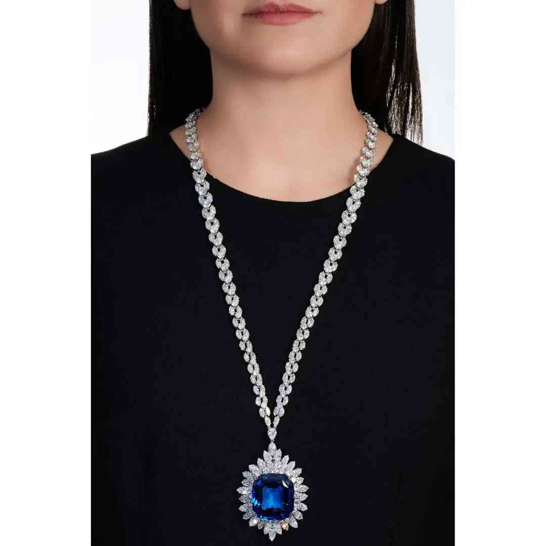 项链主石为一颗重111.73克拉的枕形蓝宝石,饰以榄尖形和圆形明亮式切割钻石。经实验室鉴定,蓝宝石产自斯里兰卡,未经加热处理,颜色达到“Royal blue”(皇家蓝)。项链下方的吊坠可拆卸作为胸针使用。