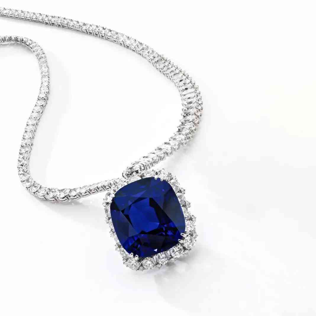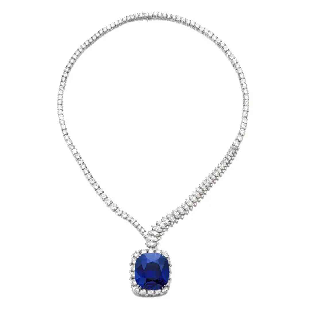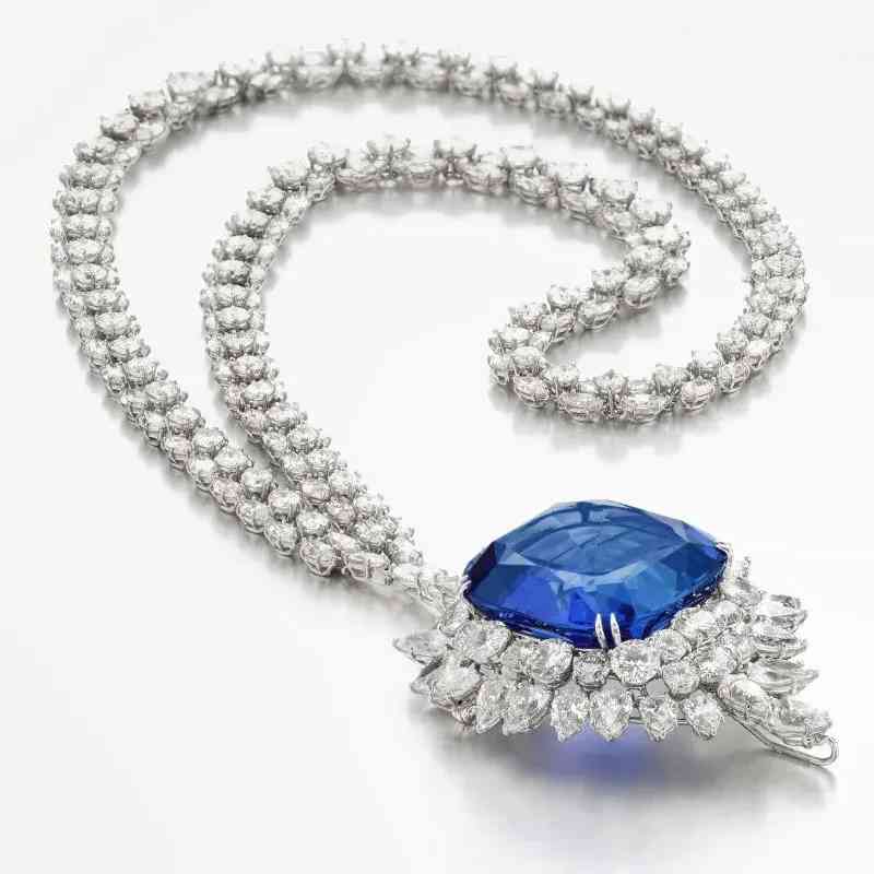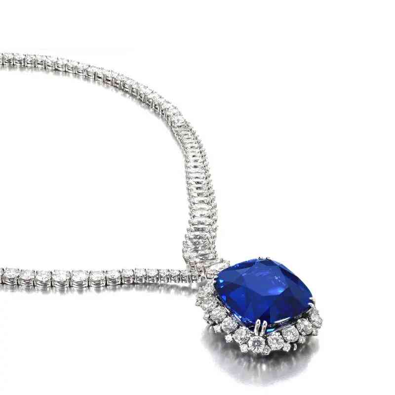 项链主石为一颗重111.73克拉的枕形蓝宝石,饰以榄尖形和圆形明亮式切割钻石。经实验室鉴定,蓝宝石产自斯里兰卡,未经加热处理,颜色达到“Royal blue”(皇家蓝)。项链下方的吊坠可拆卸作为胸针使用。