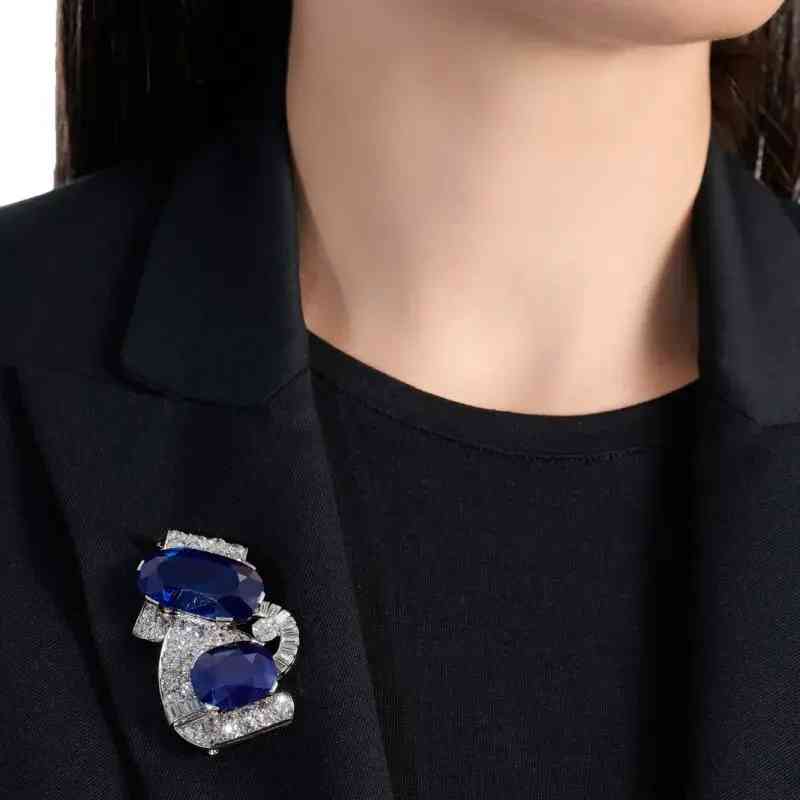 胸针设计为时尚的缎带,镶嵌两颗分别重55.19克拉和25.97克拉的椭圆形和枕形蓝宝石,并饰有圆形切割钻石和长方形钻石。经实验室鉴定,蓝宝石均产自克什米尔,未经过加热处理。