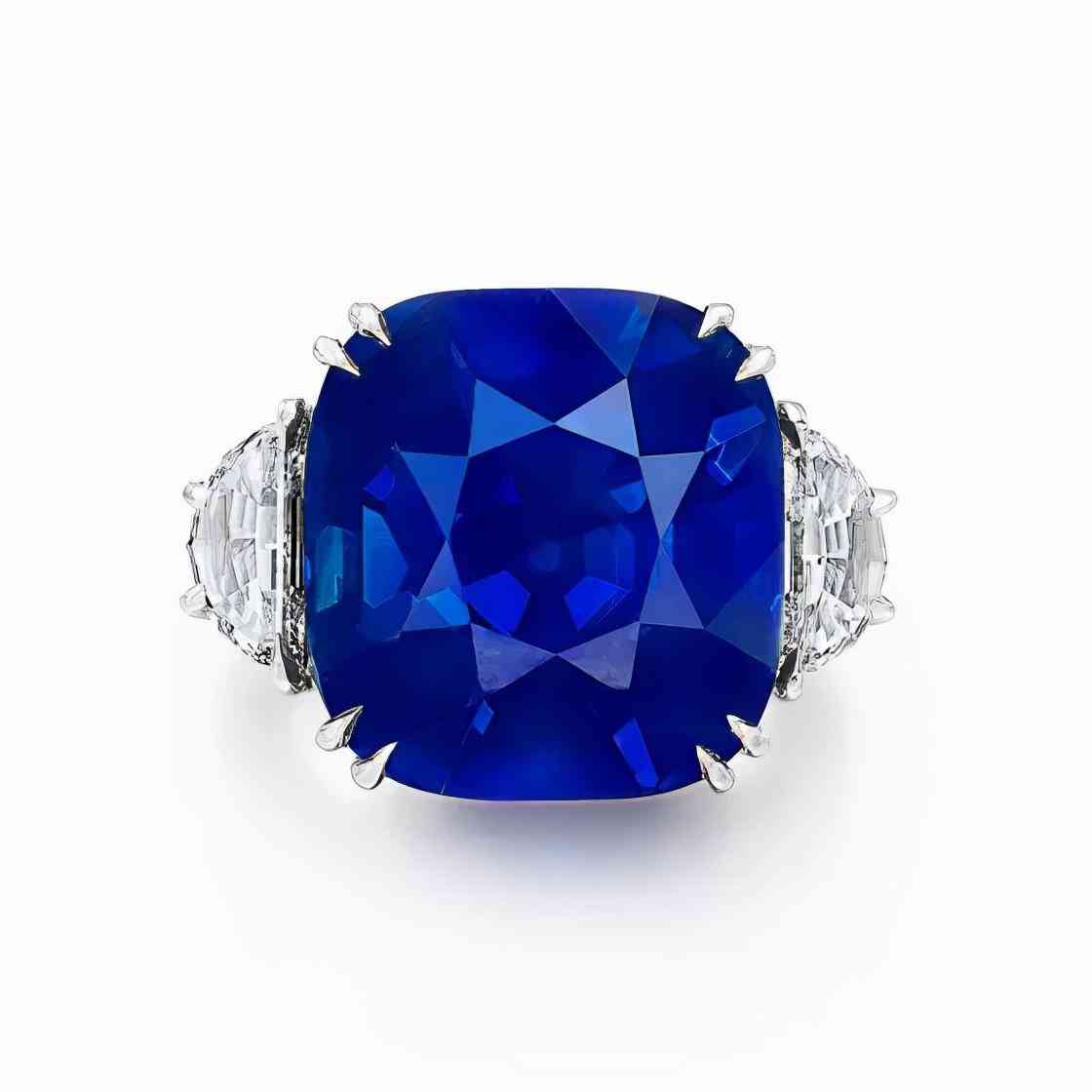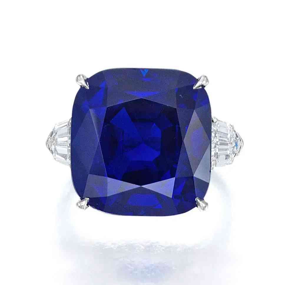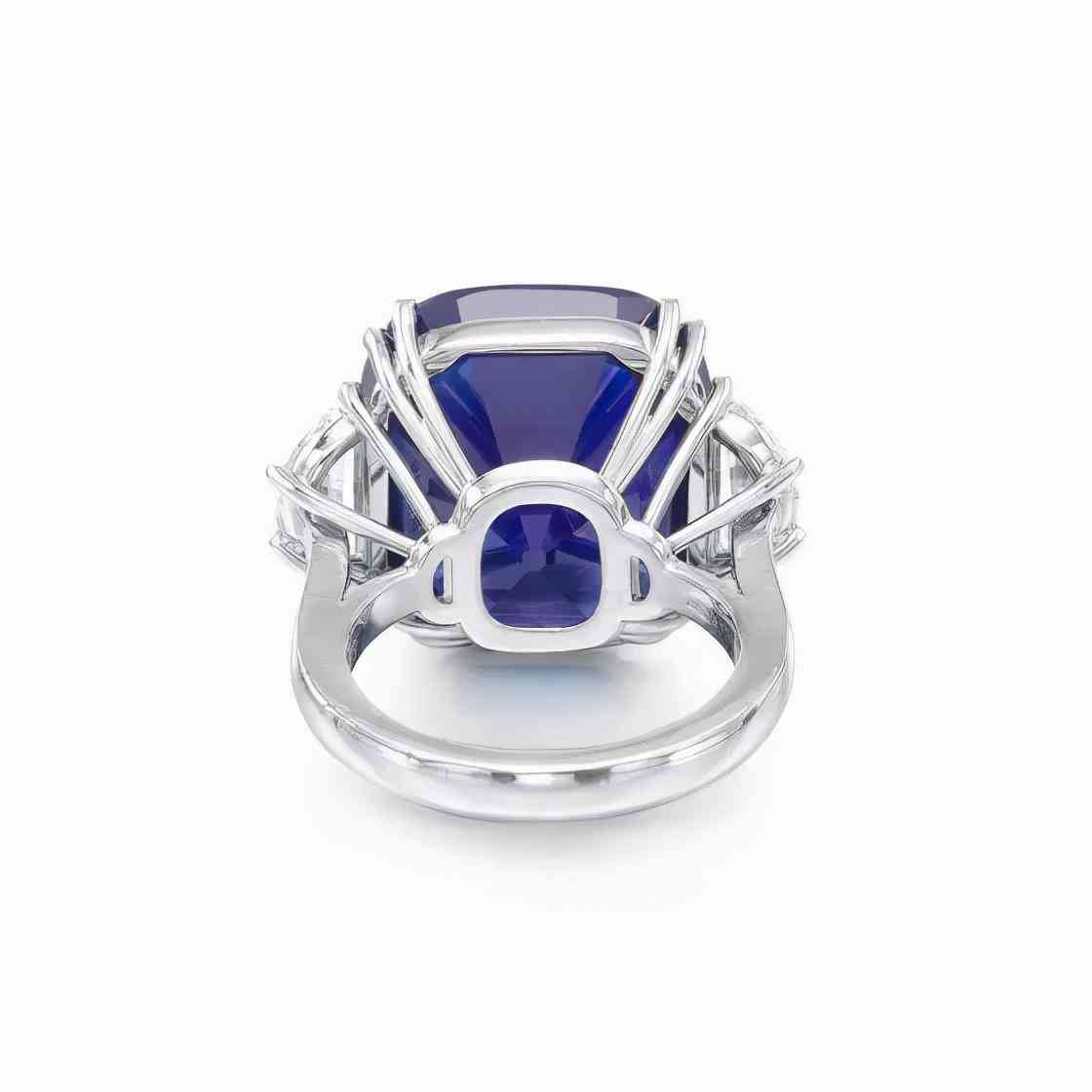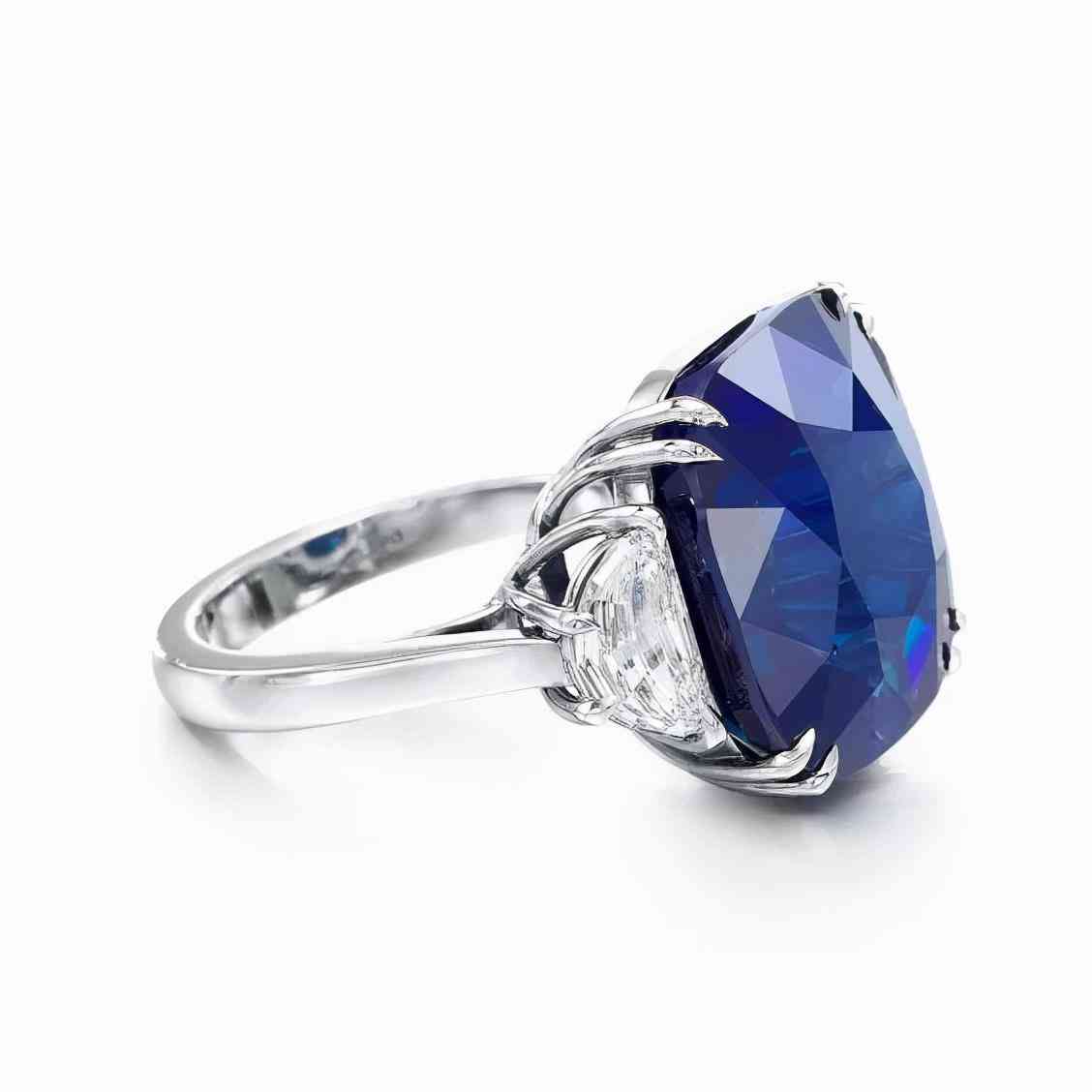 戒指以一颗重25.29克拉的枕形切割蓝宝石为中心,两侧是两颗锥形钻石,经实验室鉴定,蓝宝石产自克什米尔,颜色达到皇家蓝,未经过加热处理。