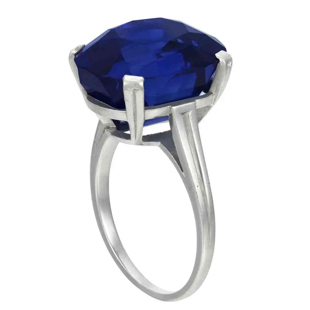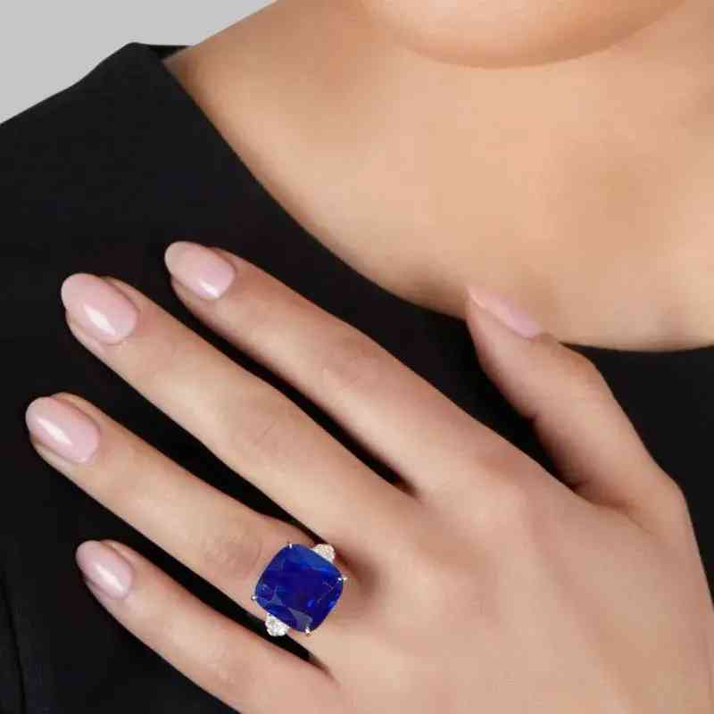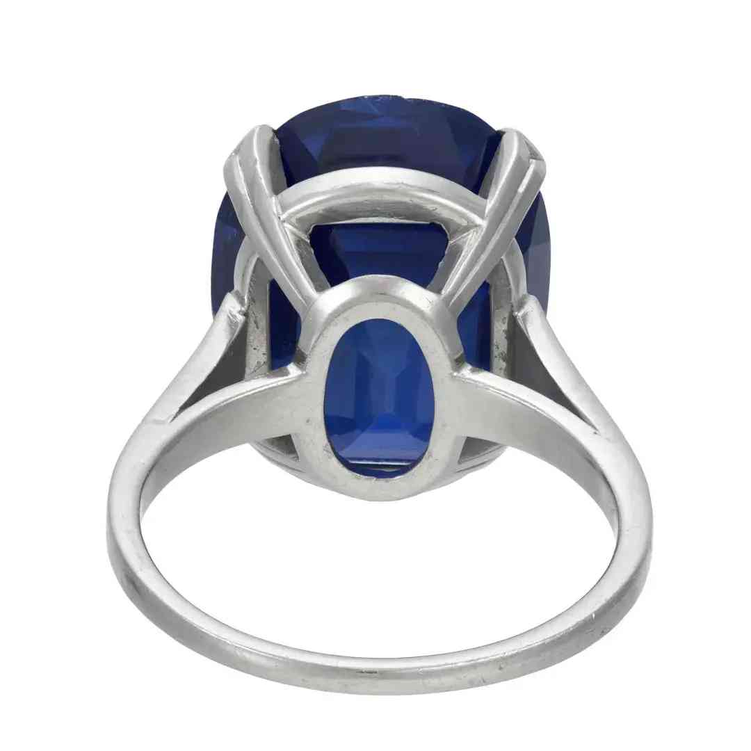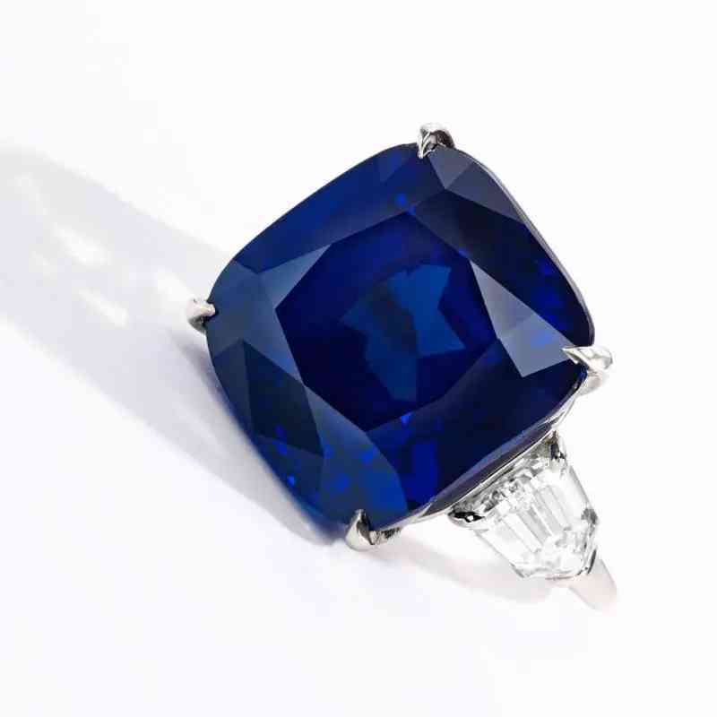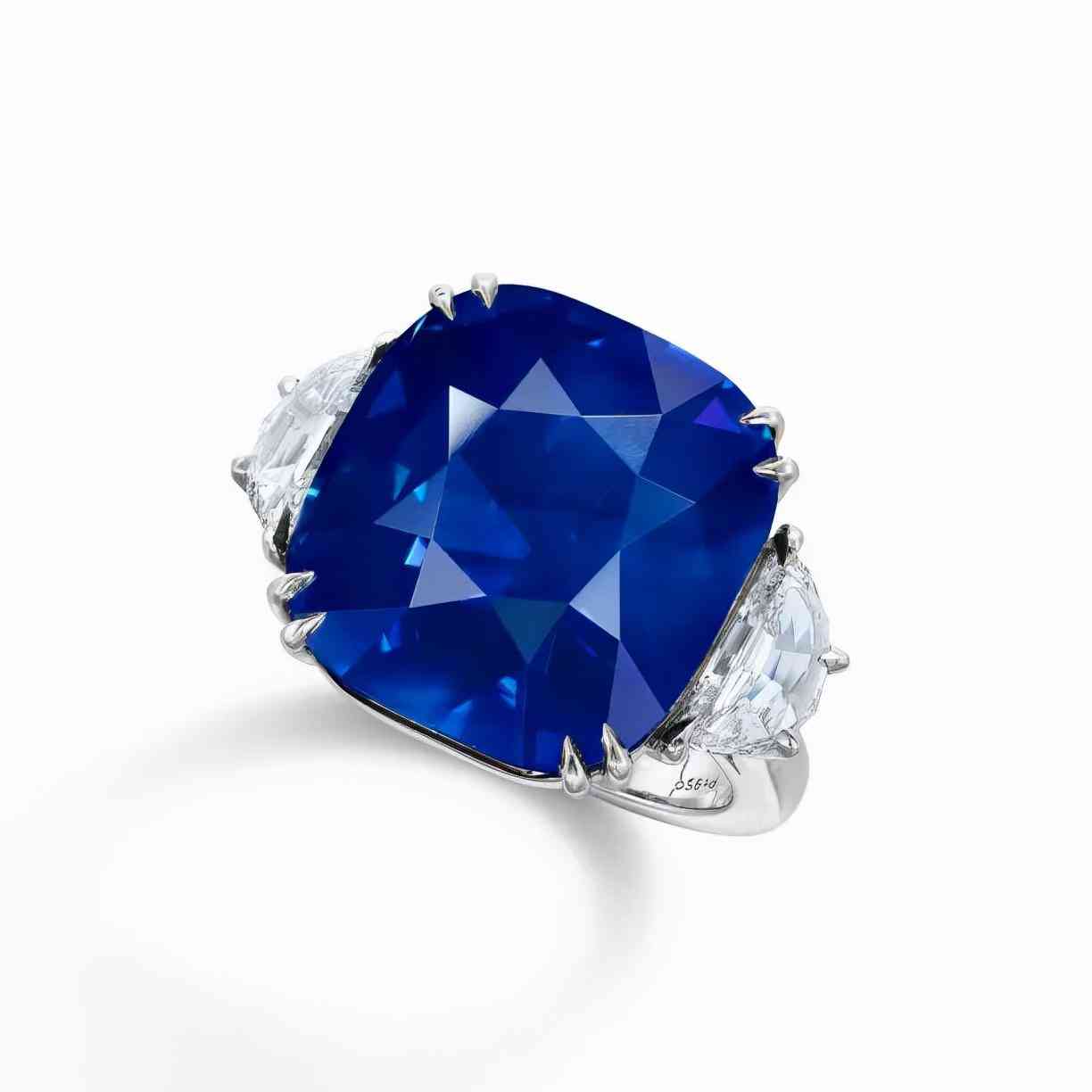 戒指以一颗重25.29克拉的枕形切割蓝宝石为中心,两侧是两颗锥形钻石,经实验室鉴定,蓝宝石产自克什米尔,颜色达到皇家蓝,未经过加热处理。