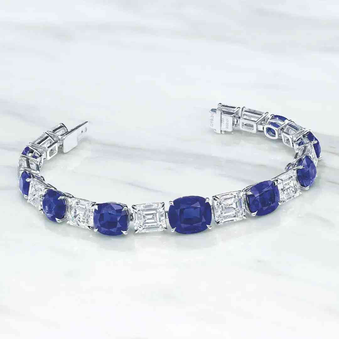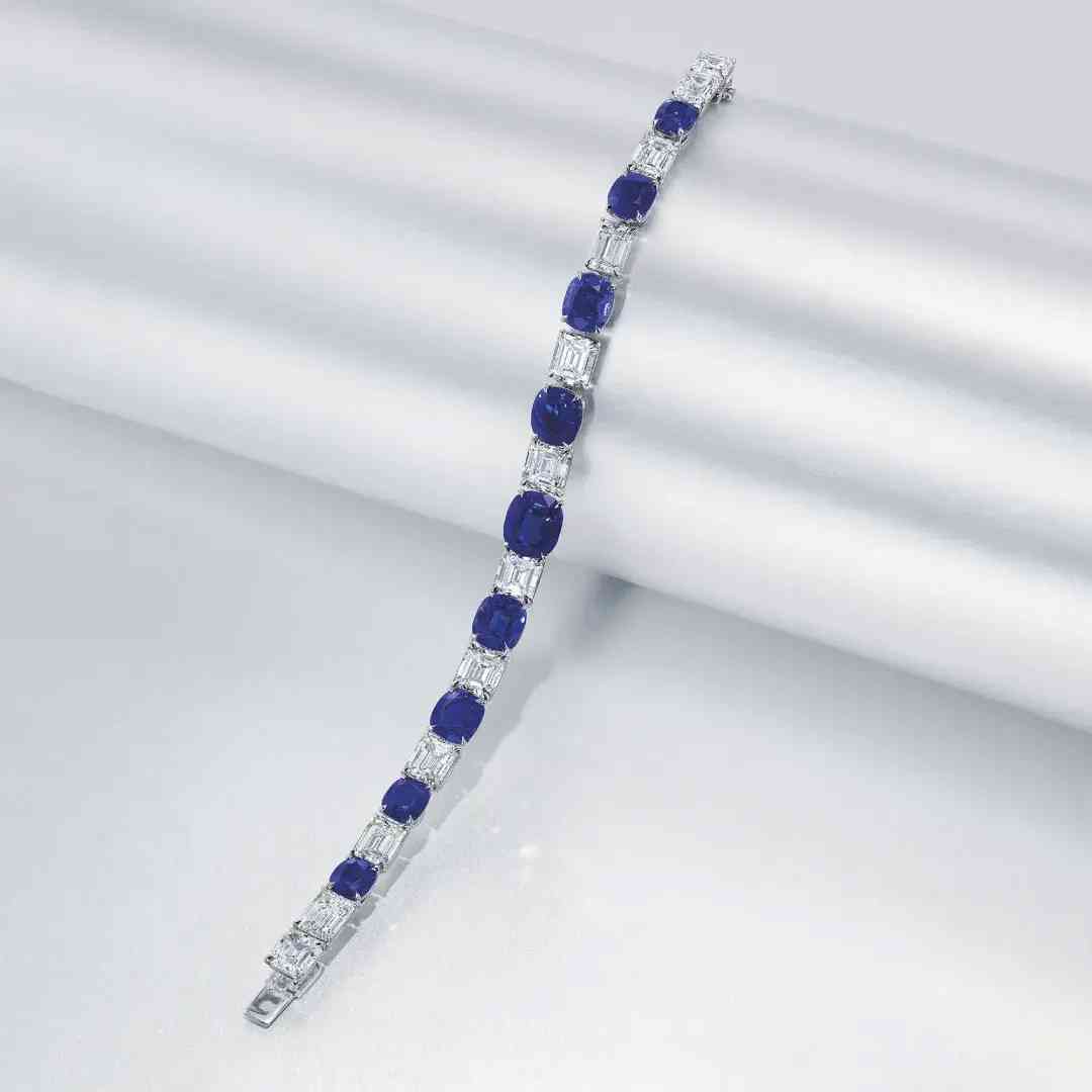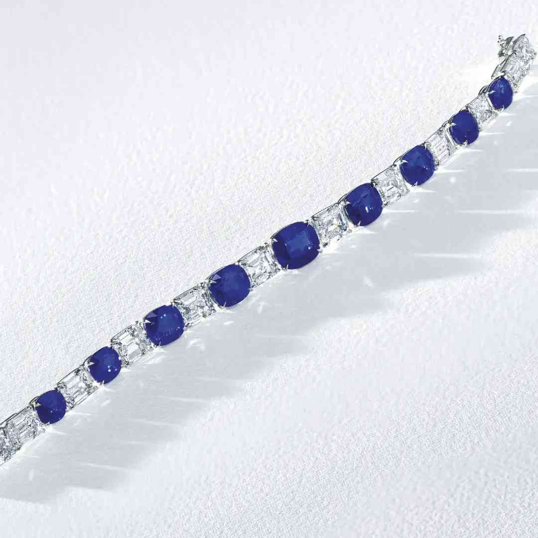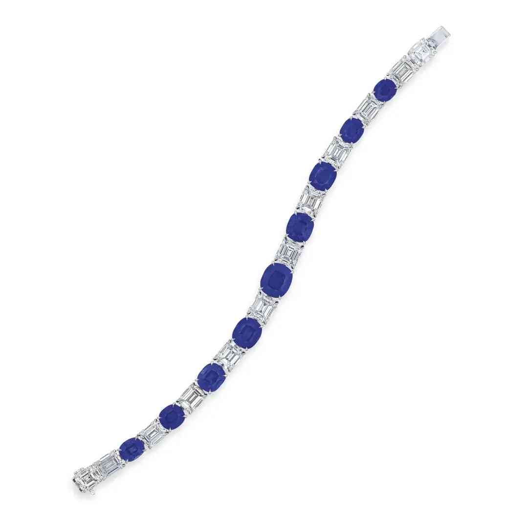 9颗5.18至1.67克拉枕形克什米尔天然蓝宝石,总重29.89克拉,配镶12颗2.68至1.49克拉长方形E-G/VVS1-VS2钻石,手链长17.7厘米。成交价 20,650,000港元(每克拉89,021美元)。