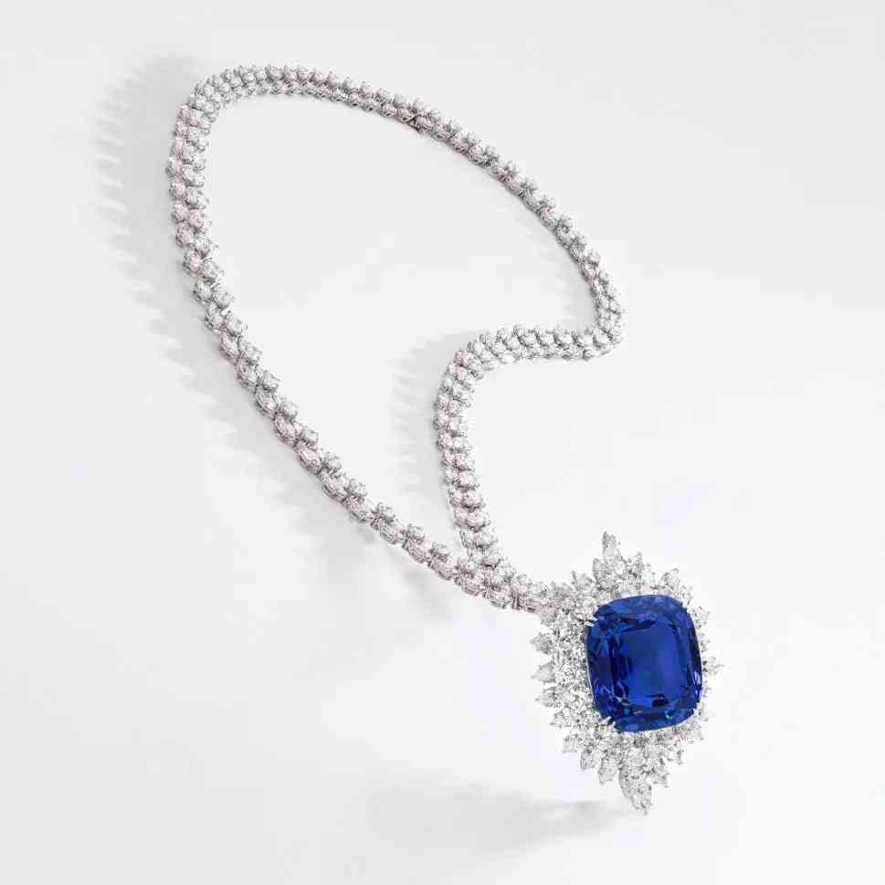 项链吊坠为一颗重126.43克拉的枕形蓝宝石,搭配一系列明亮式切割和马眼形钻石,吊坠也可作为胸针佩戴。经鉴定,蓝宝石产自斯里兰卡,未经加热处理。
