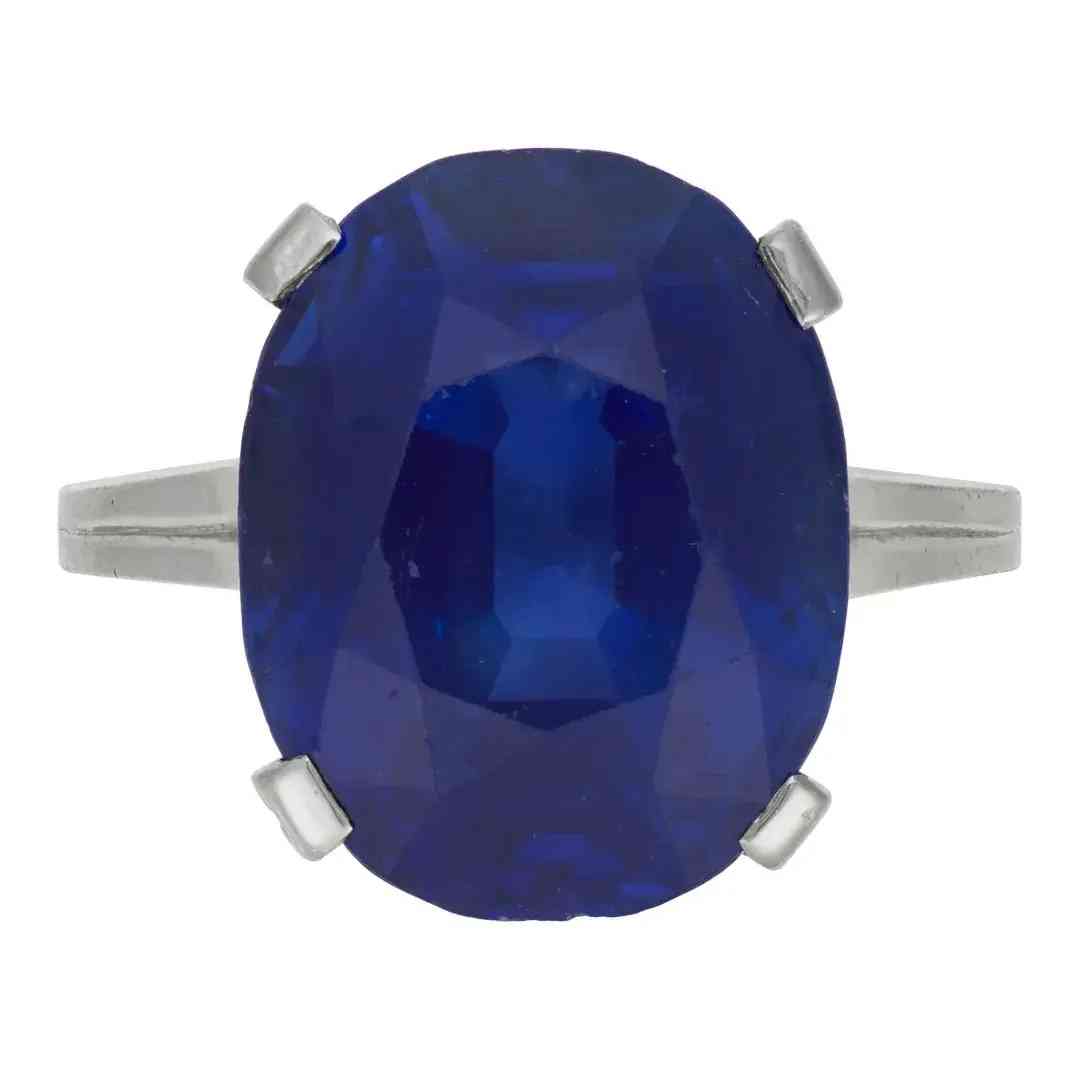 戒指主石为一颗重17.73克拉的椭圆形克什米尔无烧蓝宝石,颜色达到“Royal Blue”皇家蓝,采用铂金镶嵌,戒指毛重9.0克。