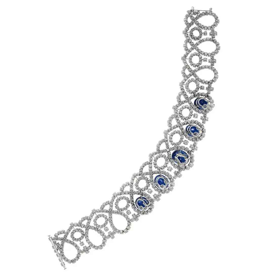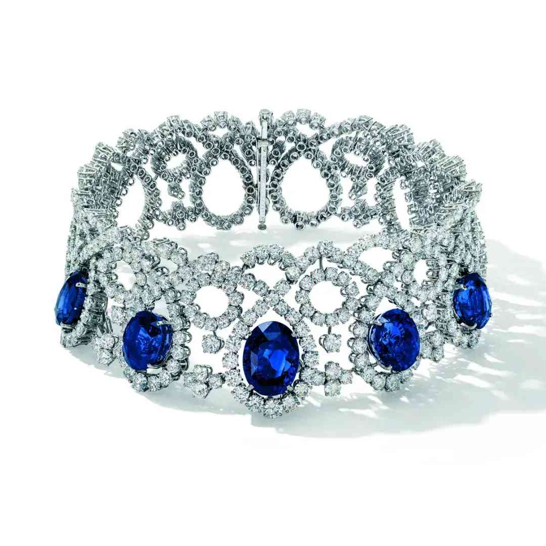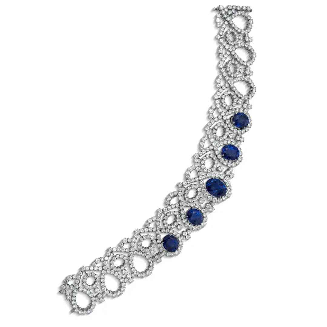 项链中蓝宝石重量分别为41.36、29.87、29.55、23.39 和 21.92 克拉,采用椭圆形切割,搭配圆形切割钻石,由铂金和黄金镶嵌。蓝宝石产自斯里兰卡,未经热处理。