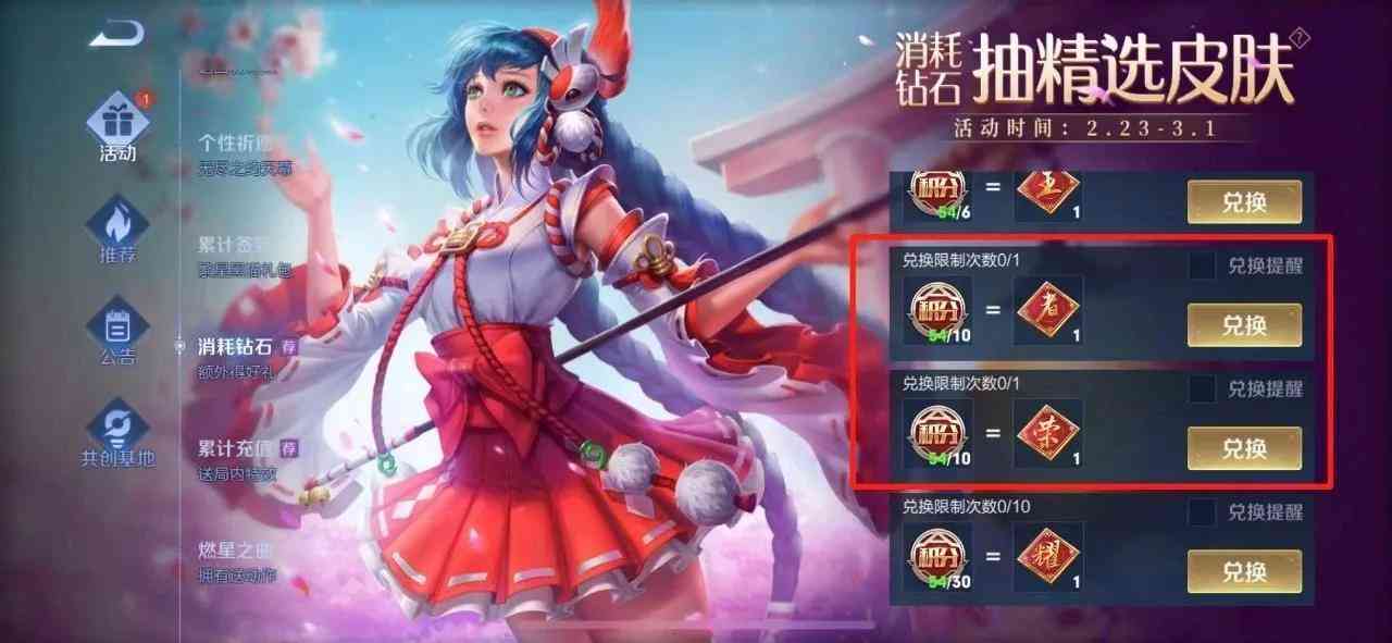 兄弟们直接兑换中间那两个“者”和“荣”的奖励即可,里面分别有一个皮肤碎片。所需积分20点,去抽一波钻石五连抽即可,四舍五入跟一键领取没啥区别。