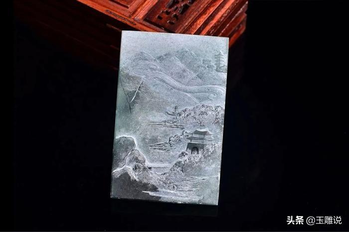 经过玉雕师的精心努力雕琢,山水挂件的毛货总算是完成了。原石上飘着的那些一团团黑黑的色彩,已变成一层层幽绿群山,当初那块不入人们眼球的毛料,此刻已是人人哄抢的翡翠山水方牌。