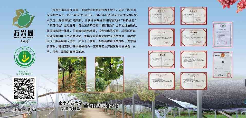 近年来,歙县加快推进现代农业发展进程,注重特色优势产业培育,从提升农产品的品质入手,邀请省农科院的葡萄首席专家孙其宝到田间地头现场指导,使万兴园的葡萄逐步走上绿色优质发展道路。万兴园的园主李波对此颇有感触:“起初我接手也都是凭经验种植,在歙县农业农村局、安徽省葡萄产业体系专家的支持下,才开始尝试改良品种、更新技术”。他至今记得一个小插曲——去年实践葡萄园人工种植三叶草,然后再用打草机割草还园时,万兴园周边百姓有不少嘀咕声:“草都不清理,能种好葡萄吗?”直到葡萄园里田间湿度与土壤有机质含量增加、葡萄外观品质变得更好后,议论才纷纷转为行动,这样子以点带面,人工种草,以草拟草、抗旱保墒等一批新理念、新技术护航,让歙县的葡萄品质一年比一年高!正是得益于如此扎实的“内功”,歙县万兴园的葡萄亩效益今年创历史新高!