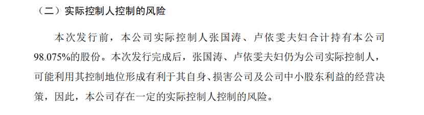 迪阿股份提示风险称,“公司实际控制人可能利用其控制地位形成有利于其自身、损害公司及公司中小股东利益的经营决策”