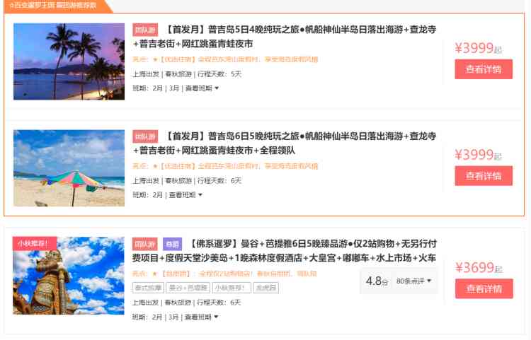 春秋旅游平台上,泰国出境团队游产品非常多,热门目的地有普吉岛、曼谷、芭提雅、清迈等,除了单一目的地游玩,还有多种组合。