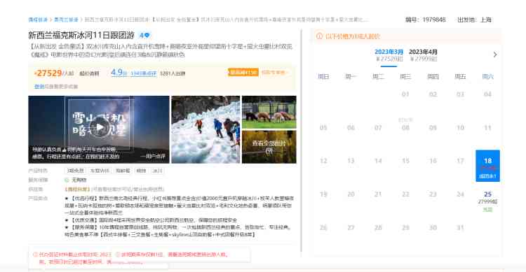 长线游方面,携程上“新西兰福克斯冰河11日跟团游”销量很靠前,它的最早一个团是3月18日从上海出发,截止2月7日13:55分,显示该团已成团,目前仅剩余1个名额。