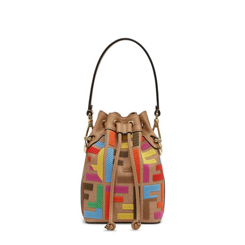FENDI/芬迪 MON TRESOR系列 女士迷你米色帆布多彩老花刺绣配可拆卸肩带斜跨斜跨单肩手提水桶包8BS010AHW7F1FSH