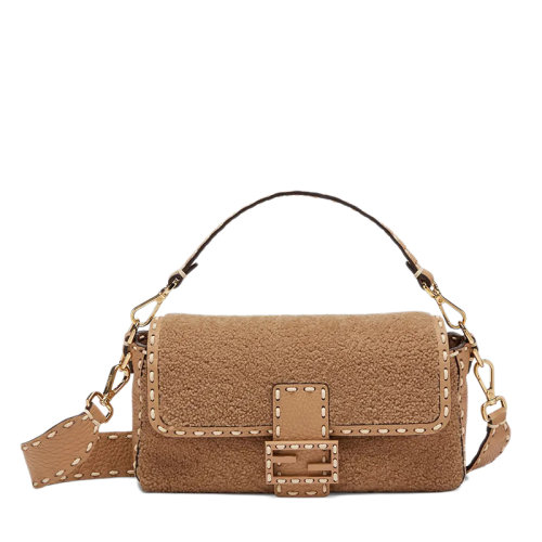 FENDI/芬迪 BAGUETTE系列 女士中号浅褐色羊毛配皮翻盖斜挎单肩手提法棍包8BR600AH96F1F7O