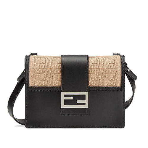 预购一个月 FENDI/芬迪 Baguette系列 男士黑色小牛皮浅米色帆布翻盖饰有协调刺绣FF图案手提斜挎单肩背包7VA524A9P6F1DZQ