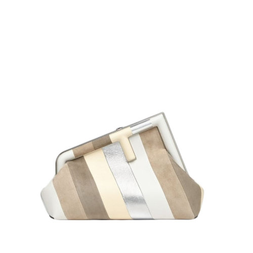 Fendi/芬迪 22年春夏新款 First系列女士小号小羊皮小牛皮F搭扣银色棕色相间手拿包8BP129AJSBF0KQ9