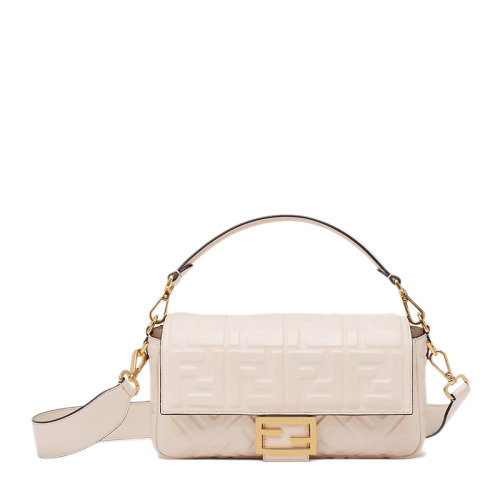 FENDI/芬迪 20 BAGUETTE系列 女士中号米色小牛皮3D纹理压花FF图案FF搭扣翻盖单肩斜挎手提包8BR600A72VF191J