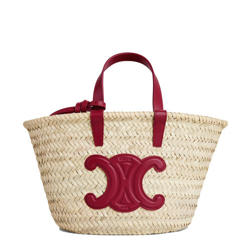 CELINE/赛琳 22新款TEEN TRIOMPHE系列 女士胭脂红色牛皮革棕榈叶编织凯旋印花手提单肩篮子包194002CGG.27CA