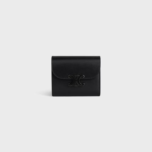 CELINE/赛琳 22新款 TRIOMPHE系列 女士黑色小牛皮黑色饰面金属搭扣按扣翻盖开合钱包10D783EQ8.38NN