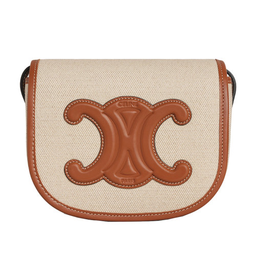 CELINE/赛琳 23春夏新款 女士自然色/棕褐色织物配皮金色金属搭扣翻盖开合单肩斜挎包188882EGC.02NT