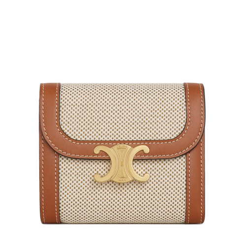 CELINE/赛琳 TRIOMPHE系列 小号织物棕褐色小牛皮饰边凯旋金扣短款钱包10D782CLD.04LV