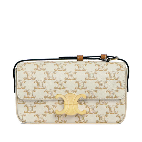CELINE/赛琳 TRIOMPHE系列 女士白色凯旋老花帆布棕褐色小牛皮饰边金扣翻盖斜挎单肩包194142CUZ.01BC