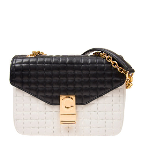 CELINE/赛琳 女士黑白拼色小牛皮方格纹绗缝经典字母C扣单肩包斜挎包链条包女包 187253-BFD-01WB
