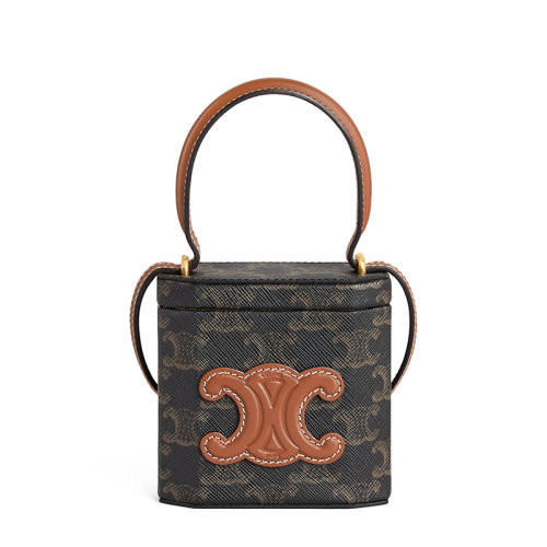 CELINE/赛琳 22新款TRIOMPHE系列 女士褐色老花帆布棕色皮革细节单肩手提盒子包199602EIN.04LU