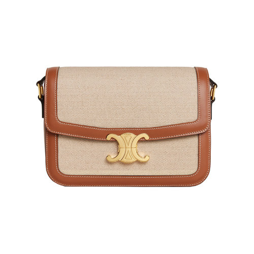 CELINE/赛琳 23春夏新款 女士自然色/棕褐色织物配皮金色金属搭扣翻盖开合单肩斜挎包191242EGC.02NT