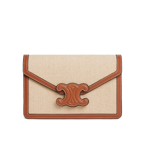 CELINE/赛琳 22新款TRIOMPHE系列 女士自然色/棕褐色牛皮革凯旋扣翻盖开合单肩手拿信封包10J972DB2.02NT