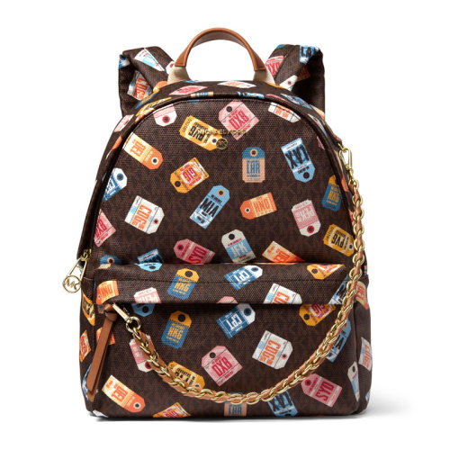 Michael Kors/迈克·科尔斯 Slater系列女士橡子棕色涂层帆布行李牌图案印花双肩包手提包背包女包 30T0G04B1O-BROWNMULTI
