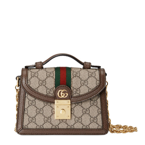 GUCCI/古驰 22春夏新款Ophidia系列 女士迷你乌木色米色老花帆布金扣红绿织带链式单肩包69618096IWG8745