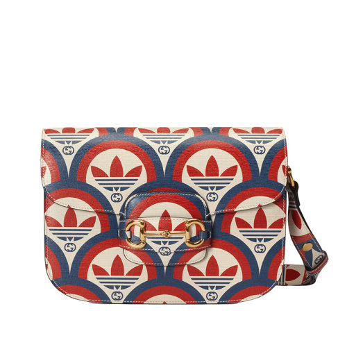 GUCCI/古驰 22新款Horsebit 1955阿迪达斯联名系列 女士蓝色红色皮革三叶草印花马衔扣细节翻盖单肩斜挎手提包602204UVG0G4168
