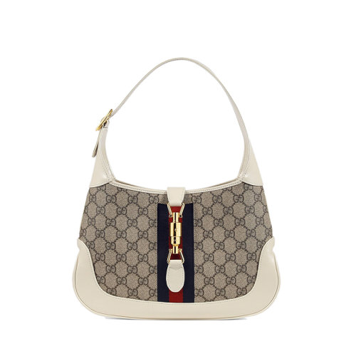 GUCCI/古驰 22春夏新款Jackie 1961系列 女士小号米色/乌木色老花帆布白色皮革滚边金扣红蓝织带装饰腋下手提包636706HUHHG9794