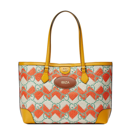 GUCCI/古驰 22新款 女士橙色草编效果老花印花织物配Ibiza皮饰黄色皮革细节金扣单肩手提托特包631685UYFHG8827