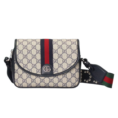 GUCCI/古驰 22新款Ophidia系列 女士迷你米色/乌木色老花帆布配蓝色皮革皮红蓝色织带细节配红绿铆钉肩带单肩斜跨包